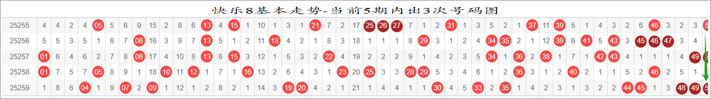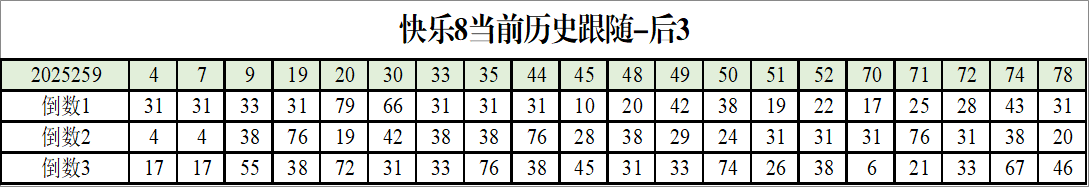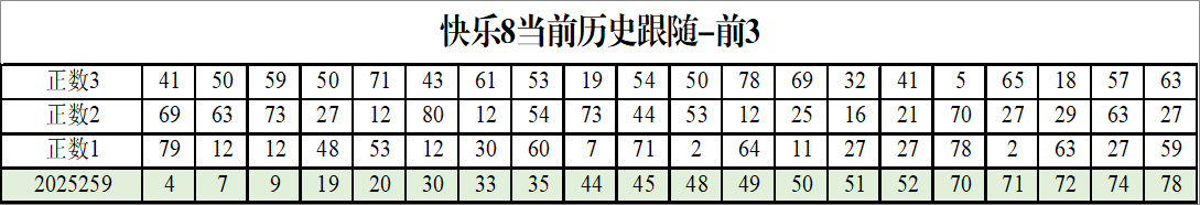 我感觉选热的同时,还要注意防冷条件开出,可以直接选取每个号码跟随出次前三的号码,也可以考虑把出次最后的三个数字加进去,不过这样可能号码太多,可以尝试。图上也能看出单独号码跟随的情况,我就不一一统计每个号码的出次了,我这里考虑提高概率,取每个号码历史跟随的前三号码和后三号码,根据2025259期的号码,我关注正数3和倒数3的号码号码为: