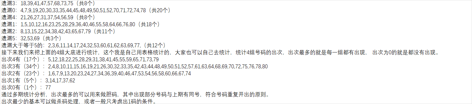 我的基本思路是通过号码尾数情况,取出6尾相关的号码作为第一组大底,然后统计号码跟随的情况分析出第二组大底,通过短期遗漏分析形成第三组大底,再按照对数补数分析统计出第四组大底(根据情况可能实时增加其他大底 ),最后把这些大底进行统计,重点关注出次最多的号码,搭配出次少的号码,灵活组号,形成本期精选胆码。