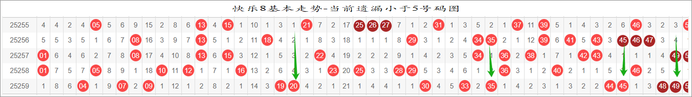 所以这个条件值得关注,从号码分布图上我们可以分析出,遗漏小于5期的号码有: