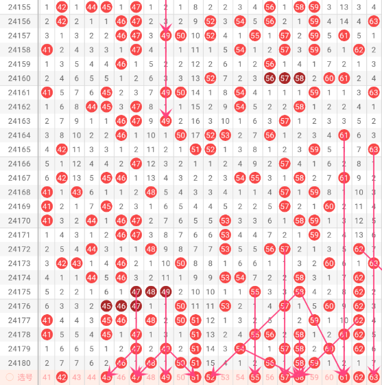 上期第3区间开出46 48 50 51 56 58 59这7个号码,尾姐今天推荐 42 45 47 49 51 52 55 57 58. 46 47 51都是三斜连的号,三选一就行。62上了六楼,这个62为起点的斜连应该也能上到六斜连,今天这个58可以考虑一下。