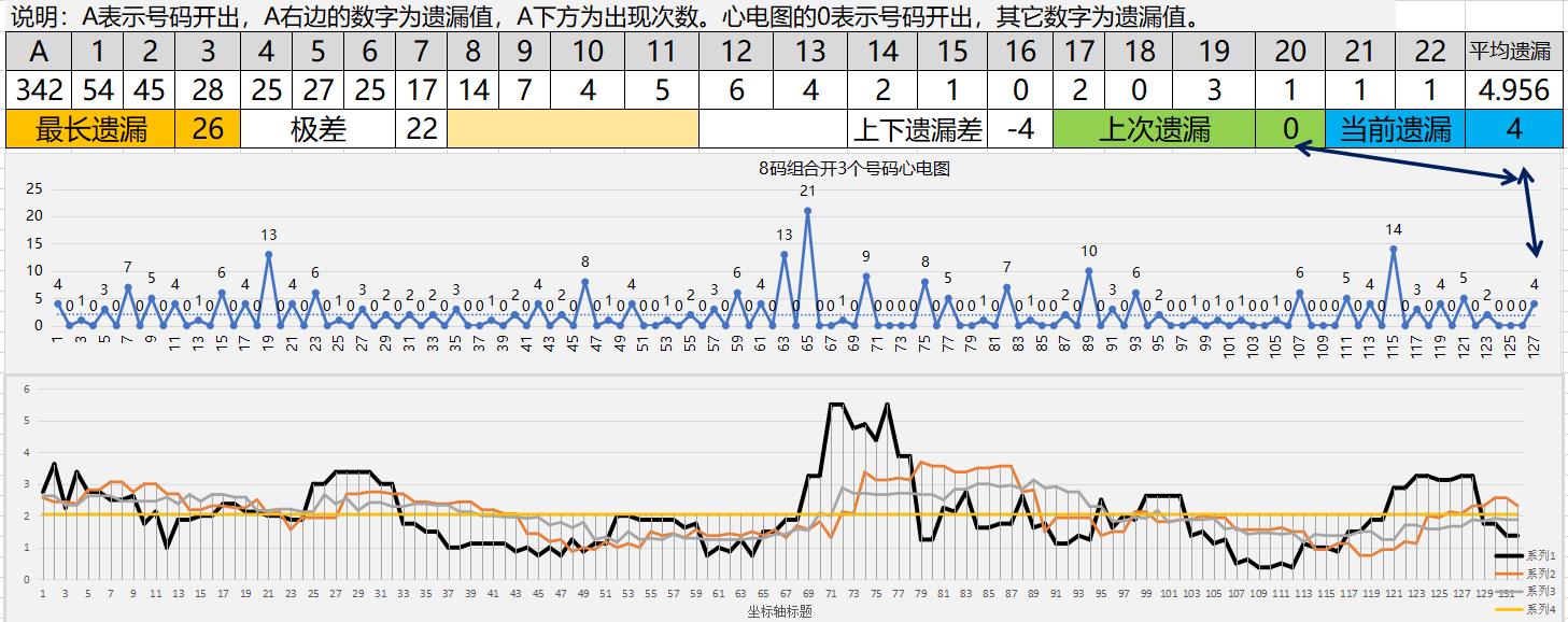 历史上这8码开3码合计开了362次,平均大概每4.68期就会开一次。当前遗漏0,表示上期就开了3个号码,而从图形上看,连续2期都开3个号码,即(0-0)走势也是有的,可以期待。
