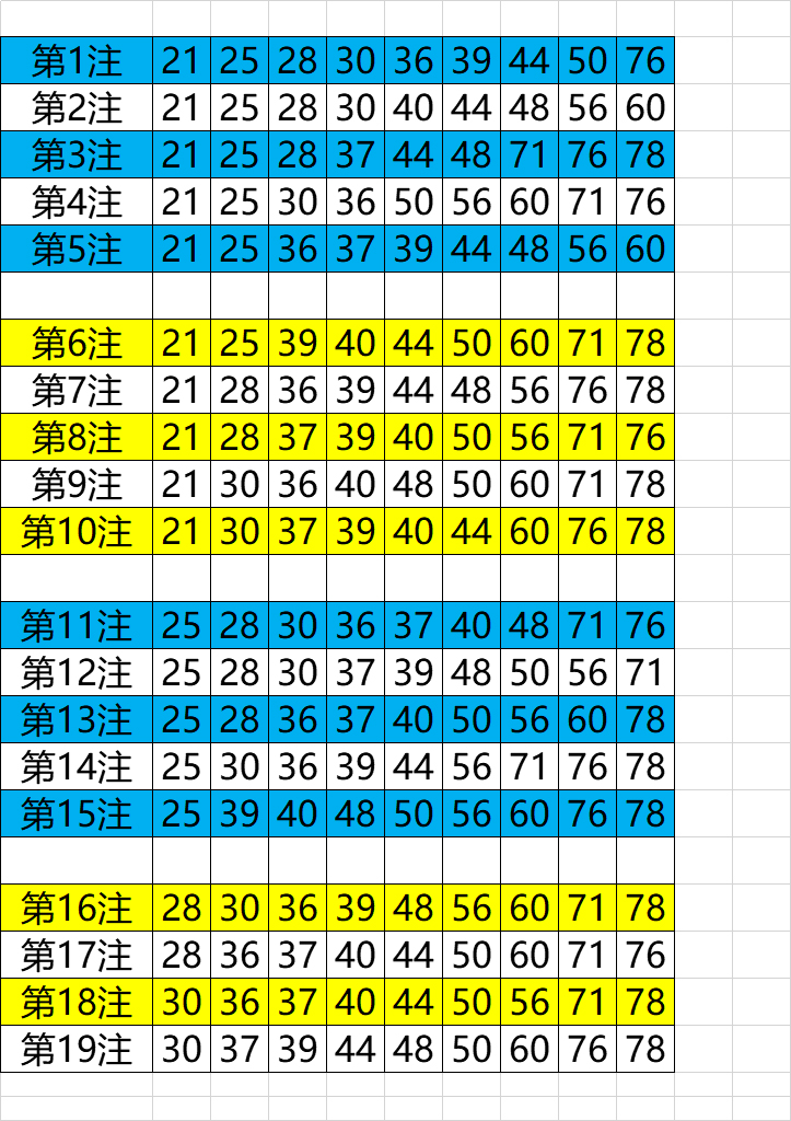 今天还是会继续采用选9矩阵,中8保6,一共是19注。如下: