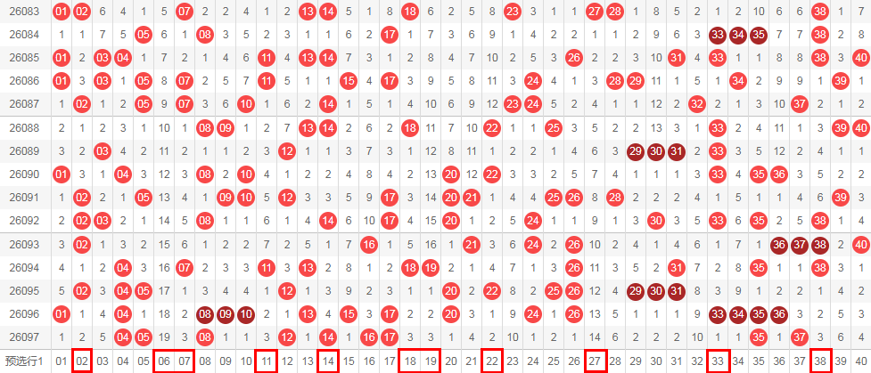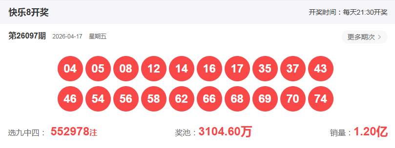 首先我们看下上期开奖结果,快乐8第26097期开奖结果:04 05 08 12 14 16 17 35 37 43 46 54 56 58 62 66 68 69 70 74,和值为:814,大小比例为: 11:9,四区7:2:5:6,开出两组两连号,分别是: 04+05, 16+17,开出一组三连号:68+69+70,直连重号出了4个,分别是:04, 08, 17, 35, 其中04为四连重号, 其余均为两连重号,我们把01-40分为前区,41-80分为后区, 则上期大号较多,值得注意的是,18-34区域出现大范围区域断层,未开出冷号,均为热号和温热号。