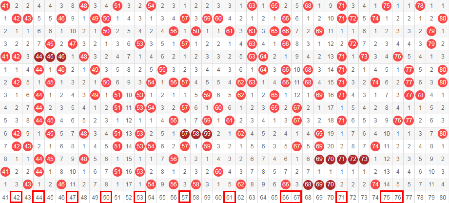 接下来我们一起看走势图,我们把01-40分为前区,41-80分为后区。