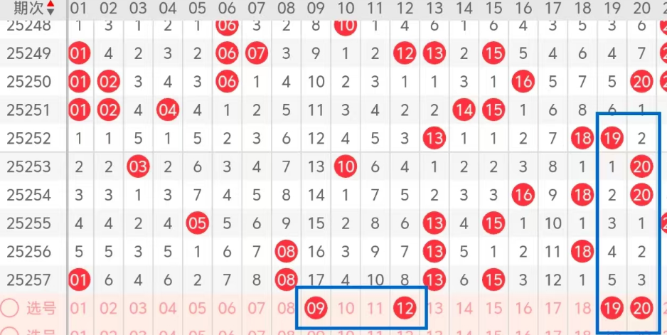 第一区间的走势分析:第一区间上期开出了四个号码球,主要的落号点位在一区间的前后半区,走出了三奇一偶的形态,一区间上期开始落号的数量开始上升,根据这一规律!今天一区间首先关注09 12这两个夹码的回补,特别是12这个号码球,走出了2-5-8尾的斜连走势,09是冷码的回补,再看凤尾处的19 20姊妹对号码的落位,20走出了16 18的斜连码走势,09 19作为同尾号的组合落下!也是热码组合,09 12 19 20大家可以打个选二复试比较安全,大家参考为主!