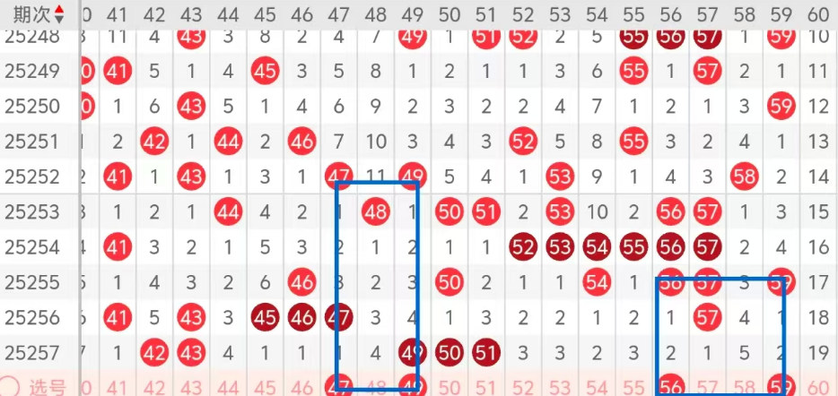 第三区间的走势分析:第三区间上期开出了五个号码球,主要的落号点位在三区间的前半区,走出了三奇两偶的形态,三区间的走势和二区间的走势一样,避开了重码热码的落位,落号转向了前半区,今天我们首先㕑47 49这两个号码组合的回补,也是热码组合,形成了隔5期的回补号码,再看后半区56 59的组合至少有一码落下,特别是56 今天回落的机会很大!防守59,走出了隔期为4-2-1的走势形态!注意47 56和49 59的组合!大家参考!