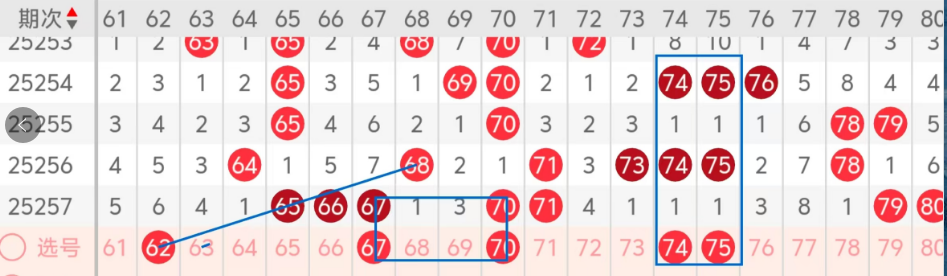 第四区间的走势分析:第四区间上期开出了七个号码球,主要的落号点位在四区间的前半区,走出了三奇四偶的形态,四区间最近一直处于走热的形态走势!三连码是这一区间的热码走势!最近几期落下三个三连码和三个姊妹对!今天我们首先关注67 70这两个号码组合的落位,67走出了69 68的斜连码走势,70走出了64 67的斜连码走势!再看后半区74 75的姊妹对落位,是两个三连码的共同号码球,今天落下的机会很大,大家参考!