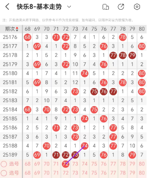 75码,遗漏间隔为6.1.5,形态为和数号,且邻近上期奖号76码,所以看好。