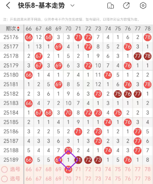 70码,遗漏间隔为10.3.1,是由冷转热的号码,且如上图所示,与往期奖号69 71码形成一个正方形,所以看好。