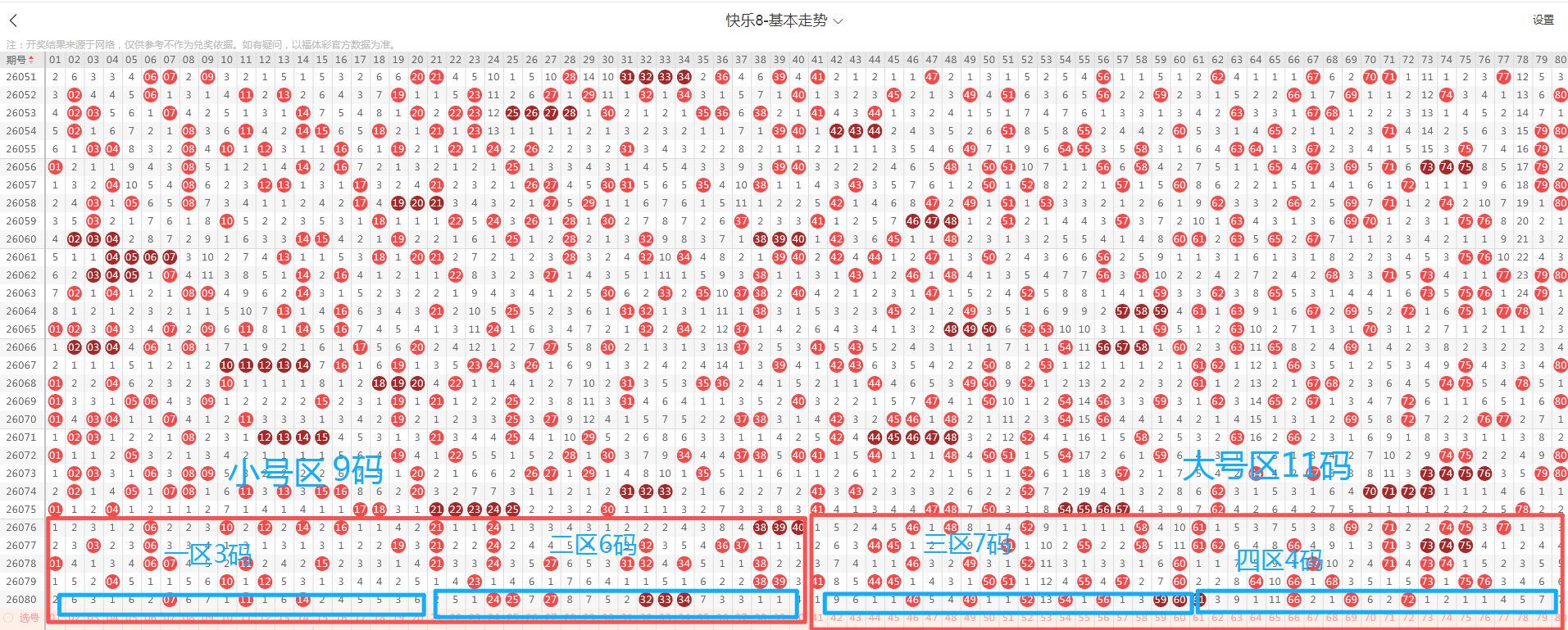 上图是快乐八2026080期区间走势图,从图中看到小号区(1-40)开出9个出奖号码,从开出数量上看与上期开出数量增加,热度上升温,从小号区近10期出号情况看,整体小号区前区近期偏温趋势;大号区(41-80)本期开出了11个出奖号码,从开出数量上看与上期开出数量减少,热度降温,从近期出奖号码个数看属于偏温态势,下期快乐八2026081期小号区号码大概率热度回温反弹,大小区间主看小区号码热度回温概率较大,大小比具体区间比可参考8:12,防10:10的比例;再从细分区间来判断,按走势图四分区分成四个区间,一区(1-20)开出来的号码有3个;二区(21-40)开出来的号码有6个;三区(41-60)开出来的号码有7个 ;四区(61-80)开出来的号码有4个;数据上看本期出奖号码集中分布在三区。从号码落位区间形态上看,快乐八2026081期主看二、三区热度回暖的态势,落号几率较大,建议密切关注。