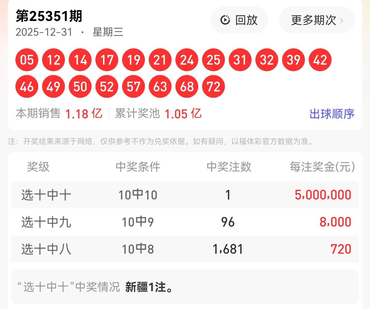 上期福彩快乐8第 2025351期开奖号码为【05 12 14 17 19 21 24 25 31 32 39 42 46 49 50 52 57 63 68 72】,其中大小比9:11,奇偶比为10:10,和值为738,跨度67,四区间比为5:6:6:3。下面是对本期对于每个号码的详细分析。