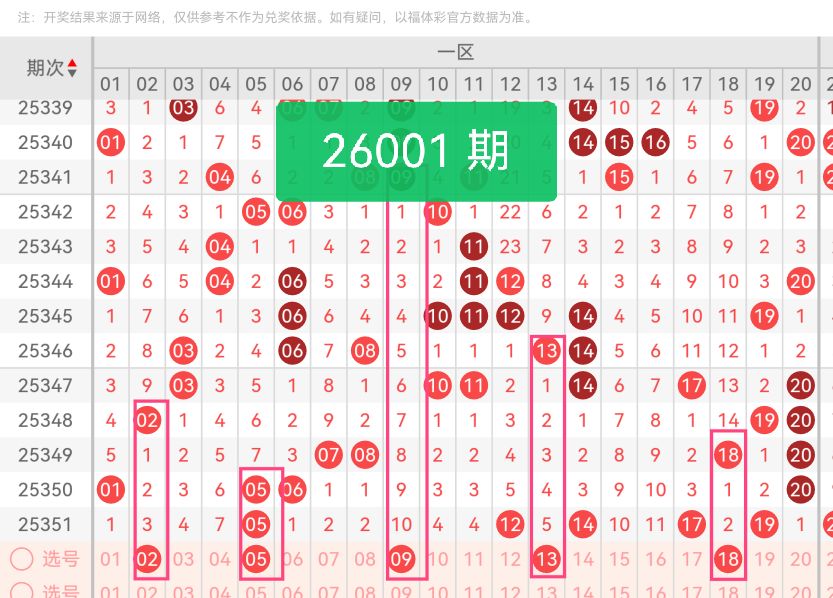 上期第一区间开奖5个号码,本期可能会稳定开出。02和05属于小尾数号码,号码在近期多期开奖中多次开出,且间隔期数较短,具备较高的出现可能性;09则是区间内的中间数值,既不属于热门高频号,也非长期冷号,处于冷热交替的临界点;13和18属于中尾数号码,13在近30期内出现6次,18出现5次,二者的遗漏周期都处于合理范围内,搭配小尾数号码能形成区间内的数值互补。