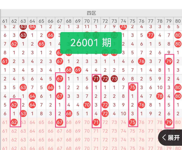 上期第四区间开奖3个号码,本期有望增加开出。62和67属于61-70区间的潜力号码,62已经间隔1期未出,处于温号回补的关键节点,67则是近30期出现6次的稳定号码;71和75属于71-80区间的核心号码,71的出号周期相对固定,每4-5期左右出现一次,75则是区间内的热门号,近30期出现11次;79是四区的最大数值之一,在历史开奖中,79常与60-70区间的号码搭配出现,能有效提升区间选号的完整性,同时79的遗漏周期较短,具备较高的出现概率。