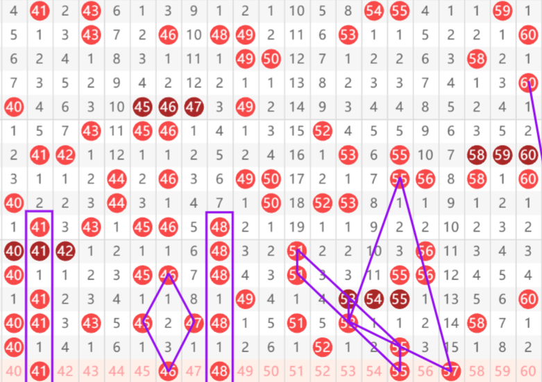 上期三区号码开出52 55 两个号码,三区间整体热度下滑,本期三区间热度上升,预计开出号码五个左右,三区间本期重点号码推荐,重号重点推荐55,邻号重点推荐关注41,孤号重点推荐关注46 48 57;