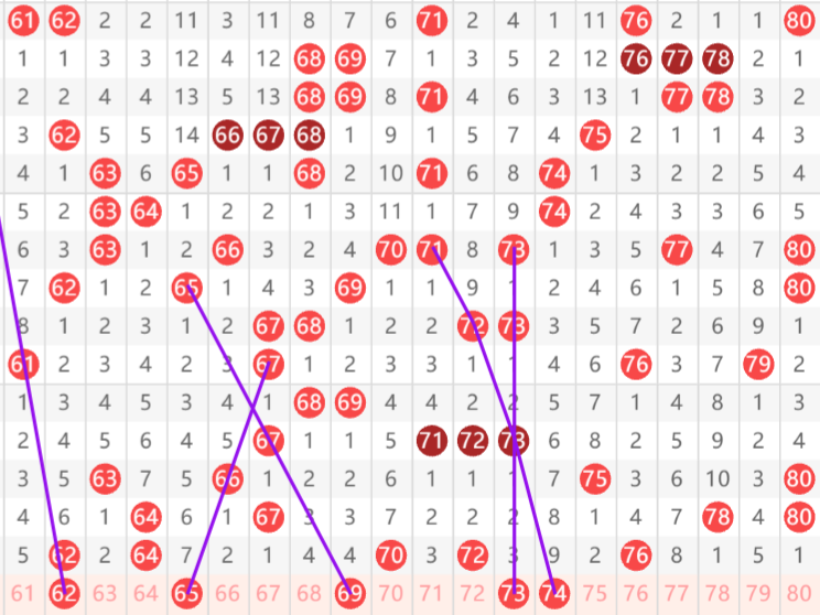 上期四区间开出62 64 70 72 76  五个号码,四区间整体热度上升,本期四区间热度持平,预计开出号码四五个,本期四区间重点号码推荐,重号重点推荐62,邻号重点关注65 69 73,孤号重点推荐74;
