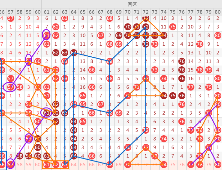 62-63: 62属于大斜连于上方规律相同落位,63也是有规律落位,注意61-62-63的开出,三选二,防三个同出.