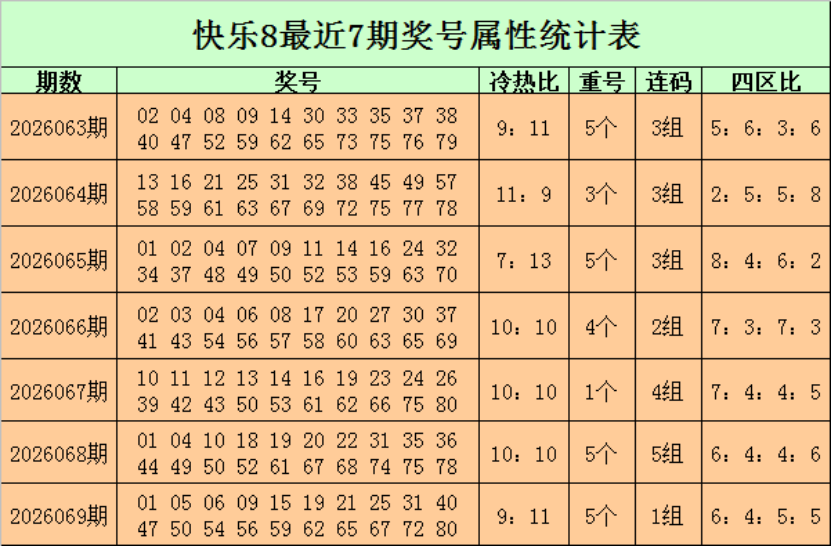 福彩快乐8第2026069期开奖回顾:01 05 06 09 15 19 21 25 31 40 47 50 54 56 59 62 65 67 72 80,其中奖号冷热比为9:11,开出5个重号:01、19、31、50、67,四区比为6:4:5:5。
