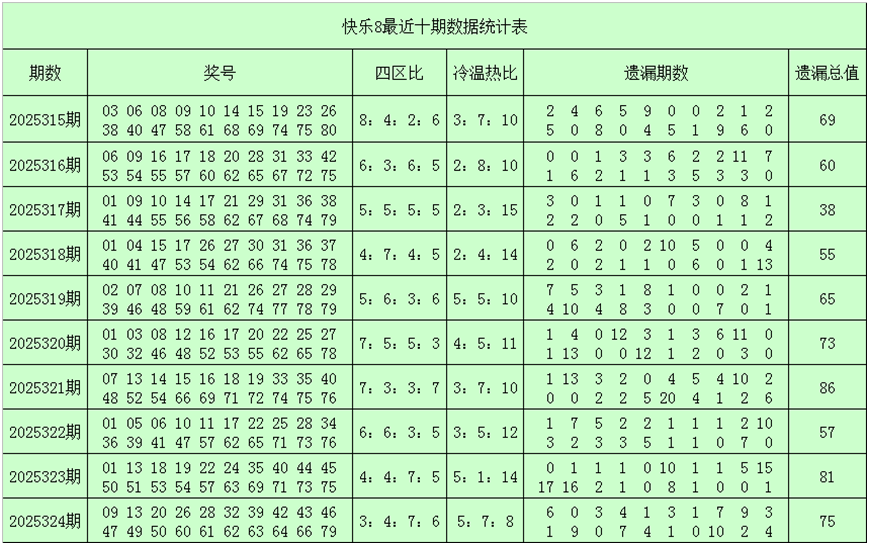 一、快乐8第2025325期奖号分析(定义:遗漏0-2期号码为热码,遗漏3-6期号码为温码,遗漏7期及7期以上号码为冷码,重码为上期开出奖号,邻码为上期没有出现,但与上期奖号差值为1的号码,例如上期开出奖号04,没有出现号码03和05,则本期03和05都为邻码,其它则为孤码。