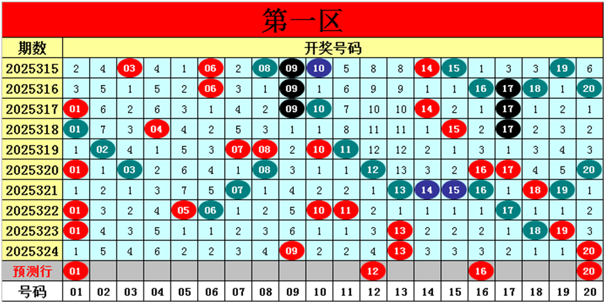 目前第一区包含11个热码:重码3个09、13、20,邻码2个10、19,孤码6个01、05、06、11、17、18;包含9个温码:邻码3个08、12、14,孤码6个02、03、04、07、15、16;包含0个冷码;号码冷温热个数比为0:9:11,重号、邻码、孤码个数比为3:5:12。