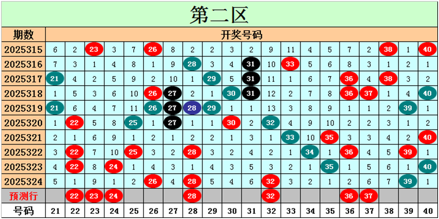 目前第二区包含11个热码:重码4个26、28、32、39,邻码2个25、40,孤码5个22、24、34、35、36;包含7个温码:邻码5个21、27、29、31、33,孤码2个30、37;包含2个冷码:邻码1个38,孤码1个23;号码冷温热个数比为2:7:11,重号、邻码、孤码个数比为4:8:8。