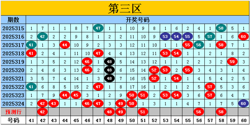 目前第三区包含14个热码:重码7个42、43、46、47、49、50、60,邻码4个41、44、45、51,孤码3个53、54、57;包含4个温码:邻码2个48、59,孤码2个52、55;包含2个冷码:邻码0个,孤码2个56、58;号码冷温热个数比为2:4:14,重号、邻码、孤码个数比为7:6:7。