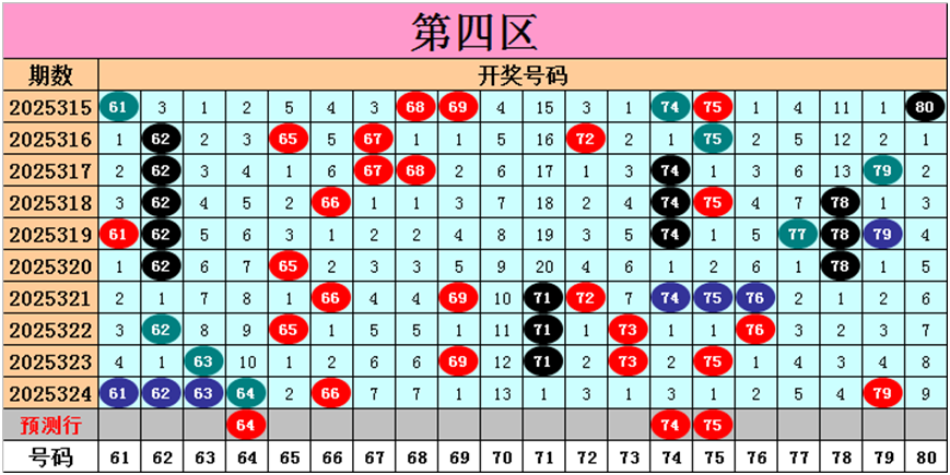 目前第四区包含12个热码:重码6个61、62、63、64、66、79,邻码1个65,孤码5个69、71、73、75、76;包含4个温码:邻码1个78,孤码3个72、74、77;包含4个冷码:邻码2个67、80,孤码2个68、70;号码冷温热个数比为4:4:12,重号、邻码、孤码个数比为6:4:10。