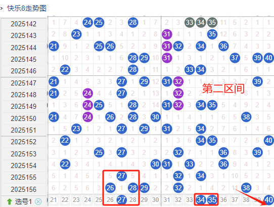 上期二区开出5个奖号(26.28.29.32.38)上期回顾二区开出了5个奖号二区间在上期落位同比前期的话呈现了一个小变的落位趋势,先来看本期号码27整体活跃度较热,在近 30 期里有一定的间歇性出现,不是每期都开,近期整体走势还是很稳定。号码34近期热度较热,间隔性也还算稳的落位,偶尔间隔多期就会再次开出,说明其在当前阶段活跃度较热注意防守。号码35近期活跃度较热,有一定的间歇性近期整体走势相对还算平稳有特别明显的冷热趋势变化,号码40近30期内活跃度较冷,没有明显的连续出现形态走势,通常间隔几期会出现一次,整体表现比较稳定。