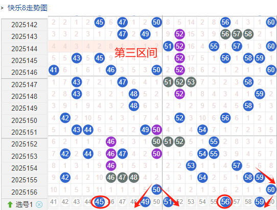三区间开出了2个奖号(50.60)上期回顾三区开出2个奖号上期的三区间的奖号数量呈现一个下降的形态,4头现在是呈现了一个冷热交替的趋势直接断号,本期先来看号码45近期出现频率相对不是很稳定,具有一定的间歇性。有时间隔期数长但是它是一个间隔比较规律走势也很稳定,说明其在近期的开奖中较冷,近期出现不算太稳定,号码51在近 30 期内出现次数相对较问热,近期的活跃度也是较一般。有一定的间歇性,通常间隔多期会出现一次,没有明显的连续出现态势,走势相对较温热,在整个第三区间的表现还是一般的。号码59走势相对近期较温热,近期没有连续间隔落号的情况,活跃度近期处于温热注意防守。