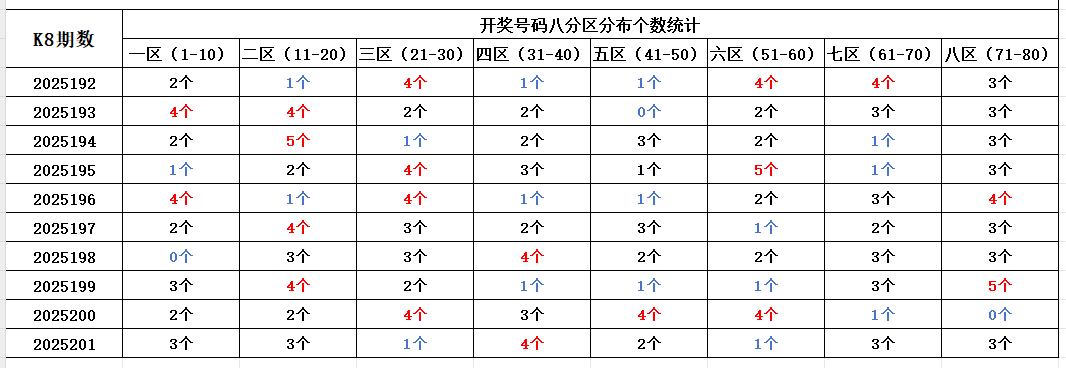 首先看上期回顾,“快乐8”第25201期开奖结果:2.3.6.13.17.18.27.34.36.39.40.41.44.57.63.67.70.71.73.76;通过分析开奖号码,分享第一个数据分析:统计开奖号码的八分区冷热走势,判断出号规律。上期开奖号码八分区走势较热的区间:四区,区间号码开出4个;走势较冷的区间:三区、六区,区间号码开出1个;八区,遗漏未出。以近10期开奖号码的八分区统计数据为例: