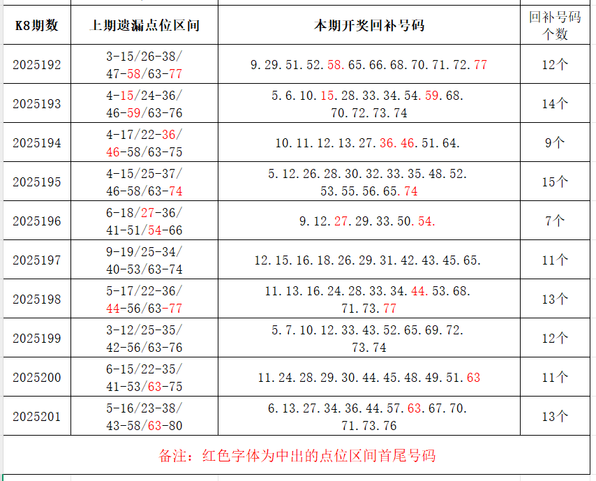 如图,上期的遗漏号码在下期开出10个左右,即为回补号码。定准点位区间首尾号码是关键!以上期2025201期(会员专区数据)为例,定位4个遗漏区间,围中13码!结合上期开奖号码,以跨度值大于或等于7为依据,本期关注5个遗漏区间:6-13/18-27/27-34/44-57/57-63;重点关注遗漏-区间:****(会员专区可见),区间遗漏号码可能在本期回补开出。注意区分遗漏区间回补号码和大底号码,不要混淆。个人分析,仅供参考。