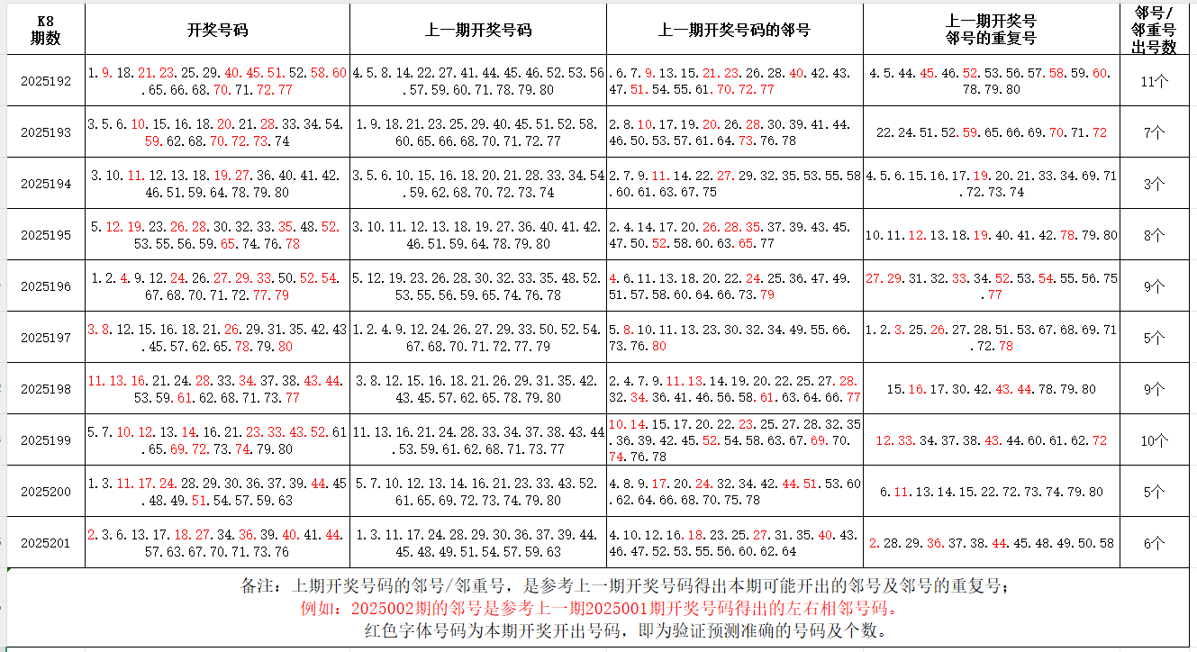 如图,红色字体是上期邻号、邻重号在下期开出,每期开出10个左右。上期邻号开出3个,邻重号开出3个。本期参考邻号:1.4.5.7.12.14.16.19.26.28.33.37.38.42.43.45.56.58.62.64.66.68.69.74.75.77;邻重号:2.3.17.18.35.40.41.70.71.72;个人分析,仅供参考。