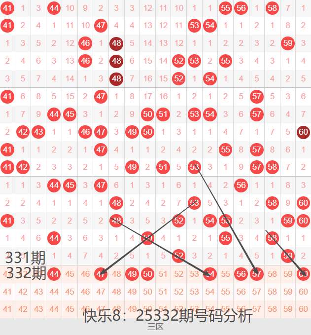 上期该区间开出号码:52 59,2个号码球,区间呈现冷开,区间整体上目前是在热开的周期,号码出号近期也比较平均,分布相对与其他大区间来说很均衡,本期二区间个人预选号码:44 47 49 50 54 56 57 59 60,44号是遗漏间隔3-2-1的状态,47号是遗漏4期的号码,均线三斜连落位走势,49号是遗漏5期的状态,50号是遗漏1期的号码,54号是遗漏2期的号码,均线四斜连落位走势,56号是遗漏4期的号码,57号是遗漏5期的号码,均线三斜连落位走势,59号本期看重码的机会,60号是遗漏2期的号码,三斜连落位点,通过以上分析,三区间终选号码:44 47 50 57 60  。