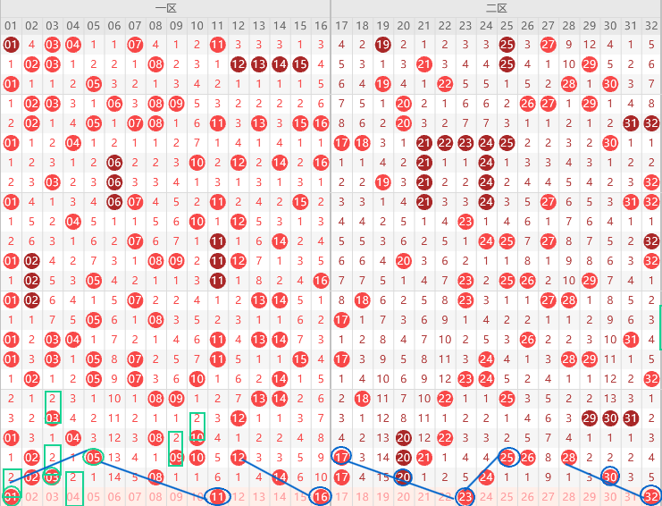 边号18 19 21 23 25 29 31出1-2码,重号17 20 24 30出一码,0尾最热,20 30二出一,形态上23 32是斜连号,上图已勾画,上期讲三连号要回补一码,本期还是接着回补29 31二出一,优先31,看不上31选29,重号防20出四直落,隔4期号出2期,本期只有18,关注五码18 20 25 28 31防29,双胆25 31