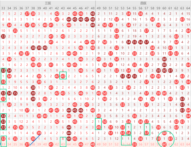 边号55 57 58 60 62出一码,重号防56 59 61,形态上58 62 是斜连号,60是梅花上图已勾画,遗漏值隔1期号出多期,本期51 53 54 57 60出1-2码,边号60 57优先,1尾最热防51 61二出一,6开头防63,关注五码51 54 57 60 63防50