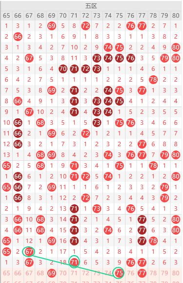 边号66 68 70 72 75 78出一码,边号断2期,本期大概率回补,重号67 71 76 77出一码,6尾近期不单出,优先66,形态上 69 75是斜连号,上图已勾画,7开头走热,本期7开头2-3码,6开头2码,关注五码66 68 72 77 78双胆 69 72