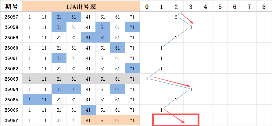 本期看好开出的范围是两码走势至四码走势之间。一尾上期开出一码走势,本期主要看好一尾的后半部分的号码,五区的号码41,六区的号码51,七区的号码61,八区的号码71都是不错的号码。走势都比较不错。当然大家也可以考虑在遗漏2期的两码01.11中选择一个号码,在遗漏3期的两码21.31中选择一个号码。