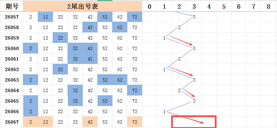 本期看好开出的范围是两码走势至四码走势之间。上期二尾开出一码走势,看好两个首码:号码02和号码12能开出其中一码。号码42是间隔三斜连的号码走势,属于本尾比较有规律的号码走势,如果本尾能开出多码走势,那么有规律的号码大概率会开出。尾码看好号码72的开出。