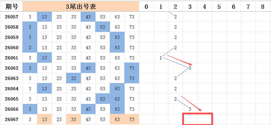 本期看好开出的范围是两码走势至四码走势之间。三尾上期开出三码走势,考虑三尾的号码,主要考虑号码33的开出,属于本尾比较有规律的号码走势,如果本尾能开出多码走势,那么有规律的号码大概率会开出。看好两个尾码:号码63和号码73能开出其中一个号码。