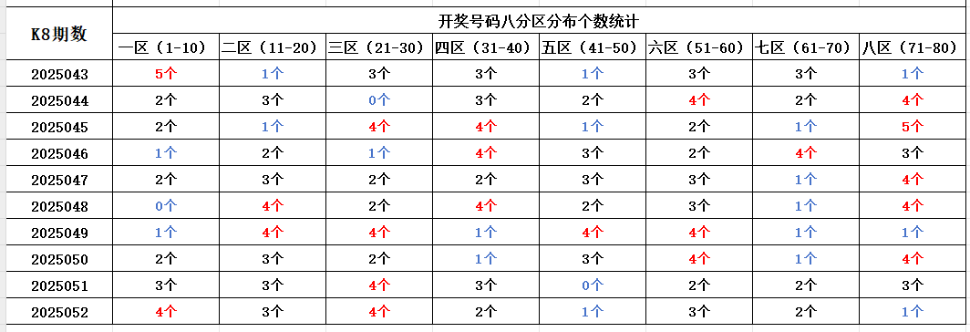 如图,红色字体是热号区,区间开出4个及以上号码。蓝色字体是冷号区,区间开出1个及以下号码。以近10期为一个分析周期,持续走热的区间:三区、六区。持续走冷的区间:五区、七区。依据久热必冷,久冷必热的规律,本期重点关注:一区、三区、六区,区间可能开出2-3个号码。五区、七区、八区,区间可能开出1-2个号码。个人分析,仅供参考。