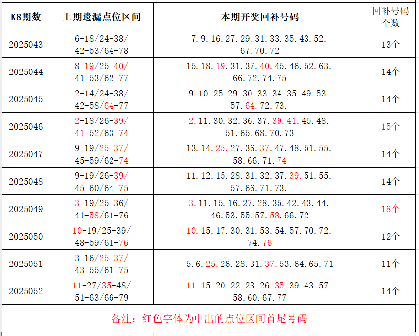 如图,上期的遗漏号码在下期开出10个左右,即为回补号码。定准点位区间首尾号码是关键!以上期2025052期(会员专区数据)为例,定位4个遗漏区间,围14码!结合上期开奖号码,以跨度值大于或等于7为依据,本期关注2个遗漏区间:43-57/67-77;重点关注遗漏区间:****(会员专区可见),区间遗漏号码可能在本期回补开出。注意区分遗漏区间回补号码和大底号码,不要混淆。个人分析,仅供参考。