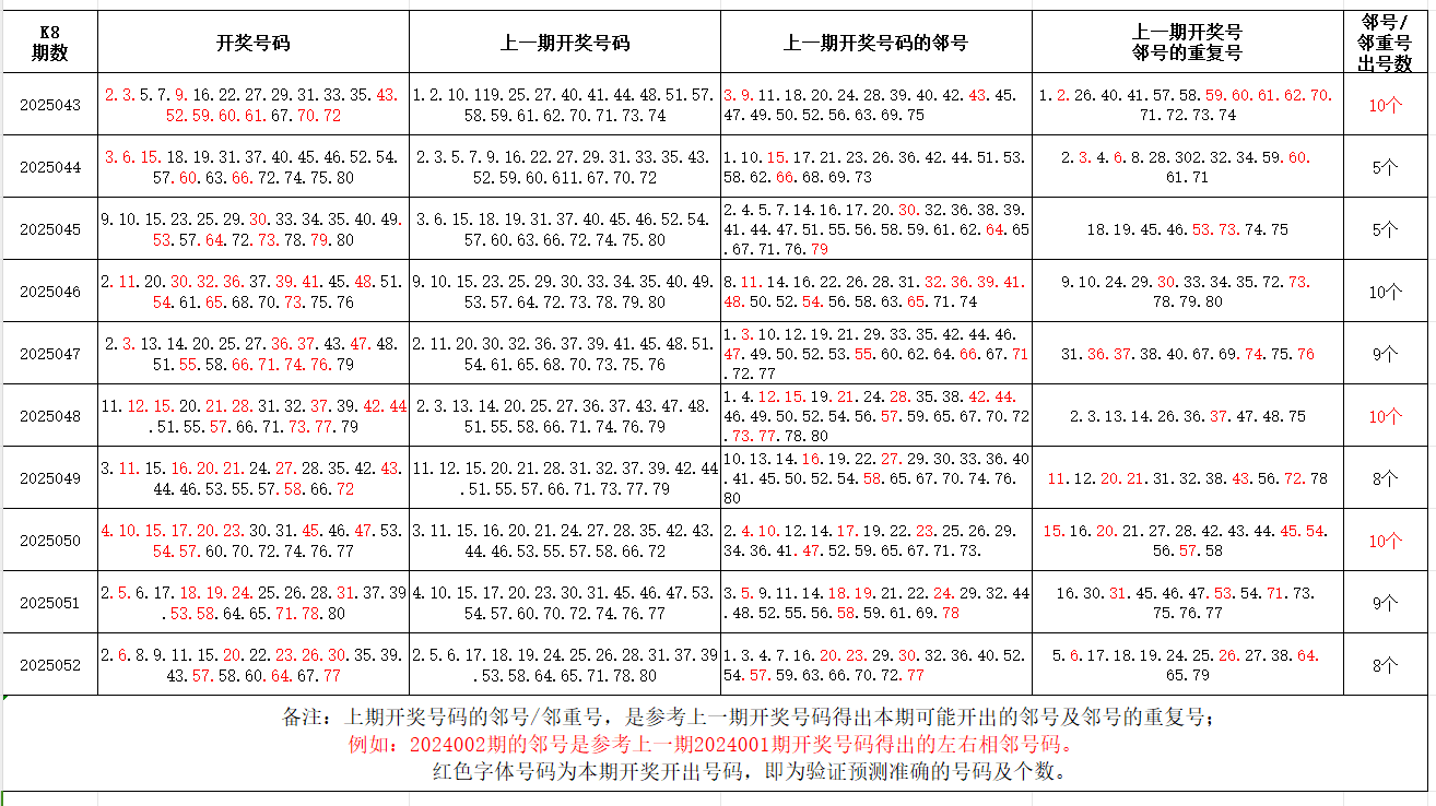如图,红色字体是上期邻号、邻重号在下期开出,每期开出10个左右。上期邻号开出5个,邻重号开3个。本期参考邻号:1.3.5.12.14.16.19.24.25.27.29.31.34.36.38.40.42.44.56.61.63.65.66.68.76.78;邻重号:7.8.9.10.21.22.23.57.58.59;个人分析,仅供参考。