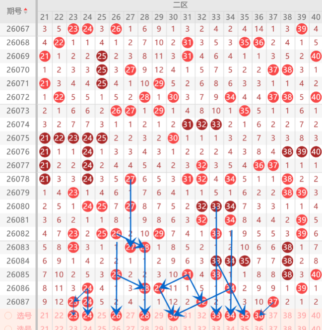 二区间注意打底是21.23.26.27.28.30.34.33.36.中关注参考2-3码开出机会,