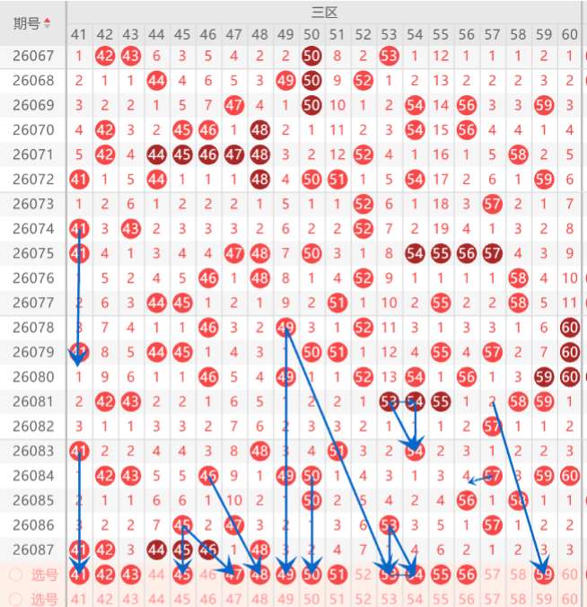 而三区的打底号是41.45.47.50.51.53.54.58.59中参考2-3码开出机会,