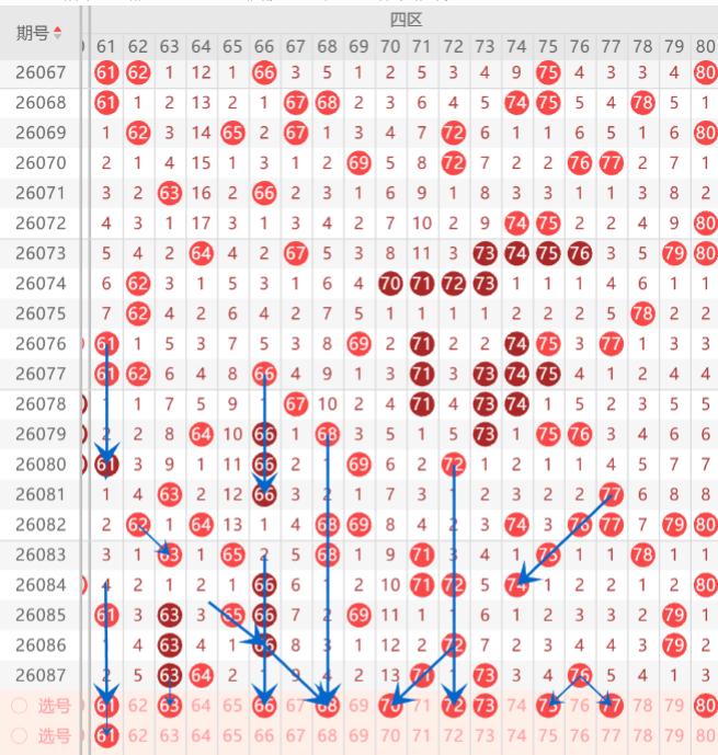 四区间关注的打底号是61.66.68.69.70.72.75.77中参考3-4码开出机会