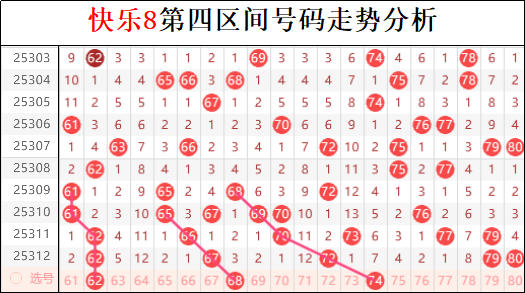 四区上一期斜连走势再出现,但是形态上更趋向于分边和重号的跟进布局。连码虽有回归走势,但是再一次出现在凤尾布局,这个前期连码未改其尾端发力特征,67、68与77、78两组连码形成双峰对峙。重号方面,70、75经历上期回补后或进入短调,但不可忽视76斜连延伸至77的跨位联动。分边布局中,61与80两端冷号需防奇偶失衡引发的反弹,尤其关注63、73同尾线在隔期轮动中的激活信号。凤尾端78作为近期高频点位,存在重复落子可能,结合79、80连带结构,可视为收官段的重要锚点。