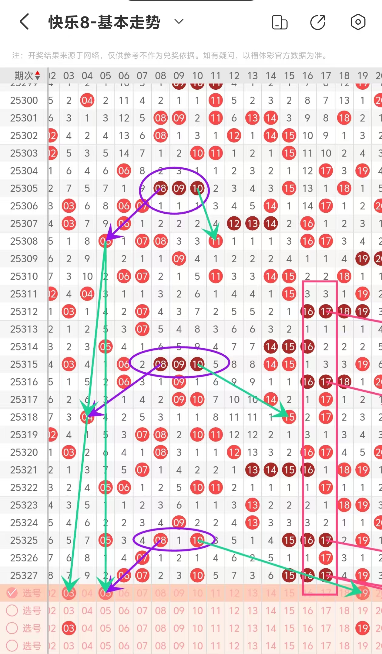看上图,先看我用紫色圆圈画出的三连选号08,09,10,08瞄准的紫色箭头向斜下连趋势连去,08,07,06,05,所以按规律这一期选择05作为大底的一部分,其次看03的绿色箭头,05斜空下连04,因此判断04也是斜空下连03,按规律所以选择03,个人看好03选作为本次推荐的金胆,我们看上面第一个紫色圆圈里的10绿色箭头斜空连下去先是11,第二个圆圈里的10斜空连下去是15,那么按规律这一期斜空连下来就应选择19(11+4=15,15+4=19),推荐19作为今天的银胆,接着下图