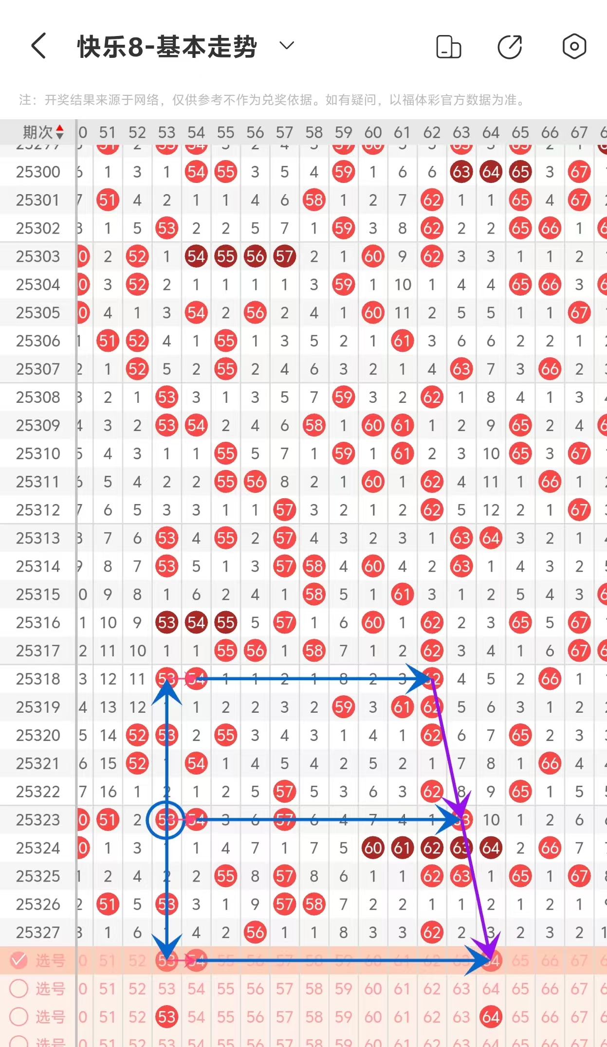 看上图的53,我画了蓝色圆圈,还有蓝色箭头,看着上面的53有上下对称关系,按规律这一期选择53,个人推荐53作为铜胆,54如图是连着53的,所以选54作为大底,我们看紫色箭头62斜空下来连63,那么以此类推63斜空下来连64,这一期就选64作为铁胆