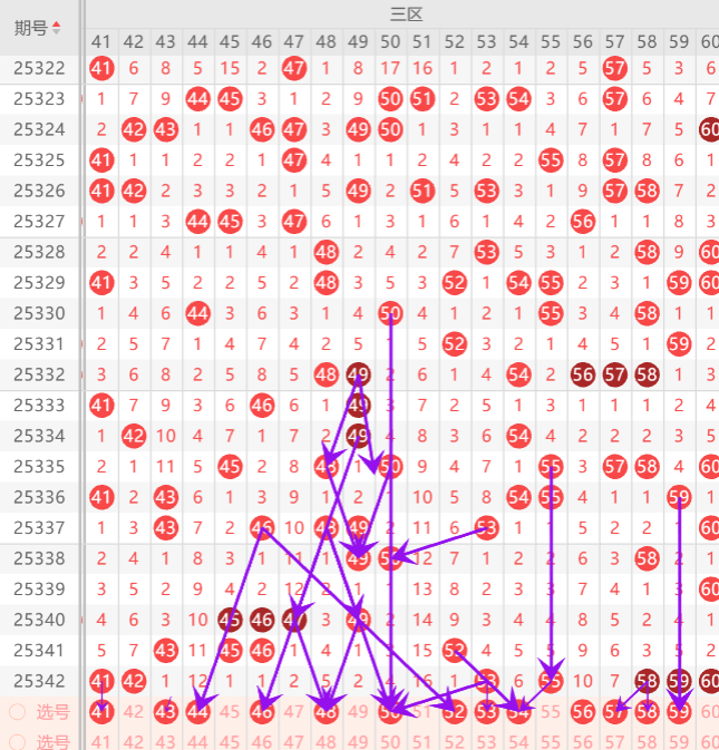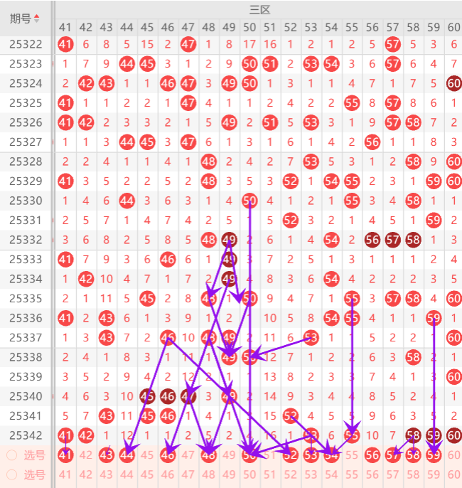 而三区的打底号是41.43.42.44.46.48.49.50.52.53.54.59中参考4-5码开出机会,