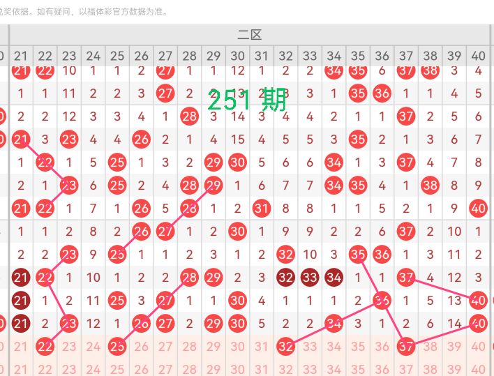 21-40区间,上期仅开出8个号码(21 23 26 27 29 30 34 40),此区间出号较多,但是短期内过热,本期此区间可能会减少开出,预计本期该区间会有3-5个号码开出。这个区间最大的特点就是容易出中间号和斜连号码以及遗漏号回补的情况。前期开出的号码21和23带动中间号码22的出现,且在形态上呈现梅花走势。号码26带动斜连号码25的出现,也在形态上呈现斜连梅花走势。前期开出的号码30和34带动等距中间号码32的出现。近期号码37都是相隔1-2期开出一次,本期有望开出。因此综合推荐该区间号码【22 25 32 37】
