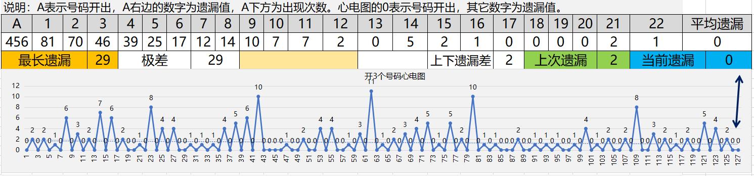 当前遗漏0,表示上期这9码组合就开了3个号码了。历史上这9码开3个的组合,合计开了456次,平均大概每4.09期就会出1次。历史上连续2期开3个号码的次数也是不少的。从遗漏10开出后开始的本轮长周期,期间遗漏峰值为8,且只有1次,次长遗漏5,也仅是1次,其它遗漏4有2次,遗漏3有1次,剩下的就是遗漏0-遗漏2,出现较为频繁,热开效应明显,值得关注。